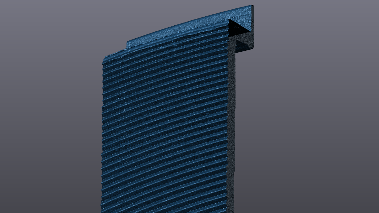 Kontrola pomocí standardního 3D skeneru – Tato metoda byla použita jako první. Dávala vcelku solidní výsledky v zobrazení celkové geometrie, nicméně vlivem nutné aplikace reflexního spreje na jemně vroubkovaný povrch docházelo k zaoblení jednotlivých ostrých hran a rádiusů. Pro přesně měření se tedy tato metoda ukázala jako nedostatečná.
