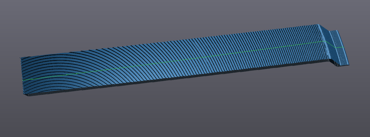 Kontrola pomocí standardního 3D skeneru – Tato metoda byla použita jako první. Dávala vcelku solidní výsledky v zobrazení celkové geometrie, nicméně vlivem nutné aplikace reflexního spreje na jemně vroubkovaný povrch docházelo k zaoblení jednotlivých ostrých hran a rádiusů. Pro přesně měření se tedy tato metoda ukázala jako nedostatečná.