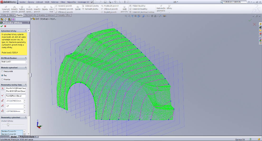 Při použití této funkce Vás SolidWorks nadále postupně provází všemi možnostmi pro úpravu sítě nebo mračna bodů. Postup práce: